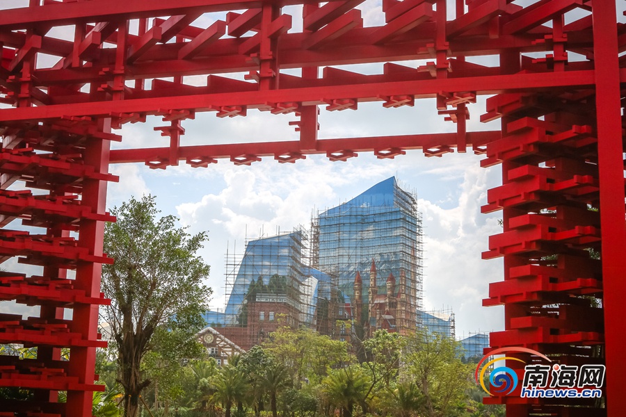 長影海南“環球100”電影主題樂園一期占地面積837畝,目前已經完成90%以上。海報全媒體中心記者袁琛 攝