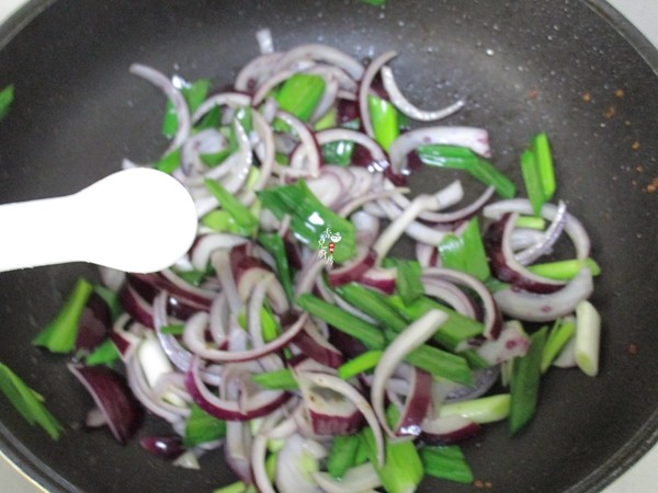 6.再把洋蔥入鍋煸炒出香味后再把大蒜入鍋繼續(xù)煸炒至大蒜變色再加入少許鹽煸炒均勻