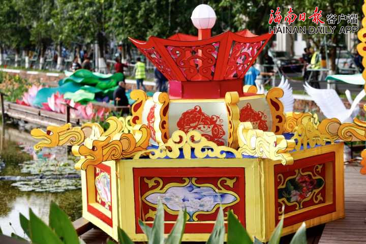 12月26日,記者在海口三角池公園看到,各色精美花燈在東湖畔有序擺放,工人在做造型拼接和通電施工。海南日?qǐng)?bào)客戶(hù)端記者陳若龍 攝