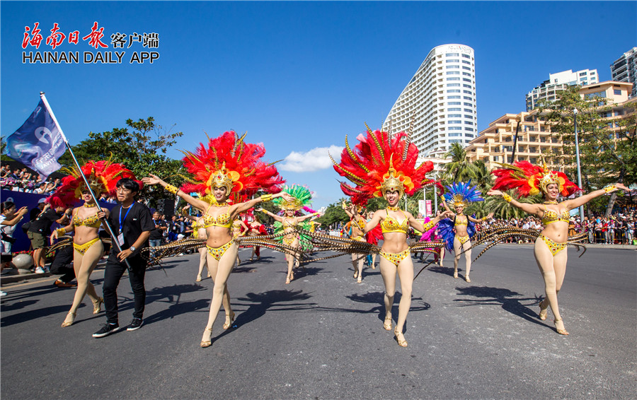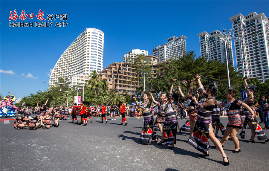 緊隨其后,志愿者方陣、青春街舞方陣、炫動三亞花車與絲路情長花車方陣、吉祥人偶方陣、黎族苗族舞方陣、電音章魚花車與重型機車方陣陸續出場,沿著三亞灣從海月廣場一路走向鳳凰島入口。