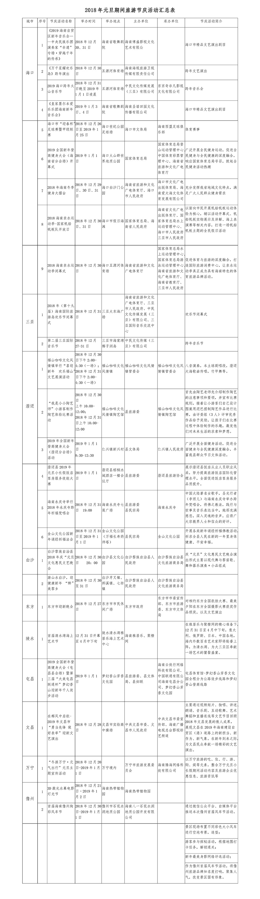 元旦期間,各市縣假日活動也精彩紛呈。??谙驆u內外游客推出了中央民族樂團演奏家“非遺”演奏會專場、皇家墨爾本愛樂樂團新年音樂會、2018年海南冬季健身大擂臺等活動;澄邁將舉行福山咖啡文化風情鎮的“喜迎春 歡樂福山”文藝展演活動、2019年全國新年登高健身大會(澄邁分會場)活動;陵水黎族自治縣將舉行首屆清水灣海上藝術節,意大利、俄羅斯、日本及海內外數百名藝術家將輪番登場,奉獻出一場國際藝術盛典;萬寧將推出吃、住、行、游、購、娛等元素相結合的“冬游萬寧·元氣出行”元旦主題宣傳活動,帶領游客體驗萬寧的魅力;儋州將舉行3D激光水幕電影燈光節活動、首屆海南儋州絢彩風車節活動等。