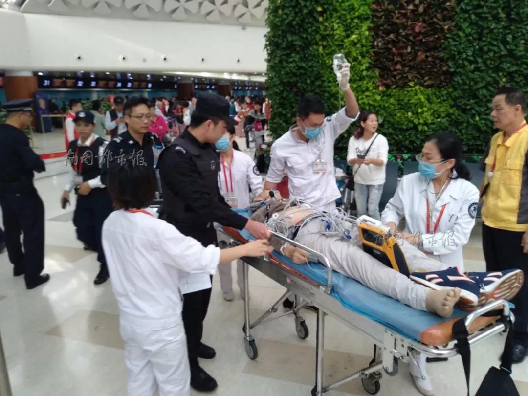 在現(xiàn)場工作人員前期的簡單處理后,8點46分,美蘭機(jī)場醫(yī)護(hù)人員到達(dá)現(xiàn)場,立即開展搶救工作,給予胸外按壓,正壓通氣,連接AED和監(jiān)護(hù)儀,氣管插管,連接呼吸機(jī),開通靜脈通路、靜推腎上腺素1mg,每隔3分鐘1次,共4次。9點03分,患者呼吸心跳恢復(fù),由海口市120急救中心轉(zhuǎn)運至海口市第四人民醫(yī)院進(jìn)行進(jìn)一步治療。