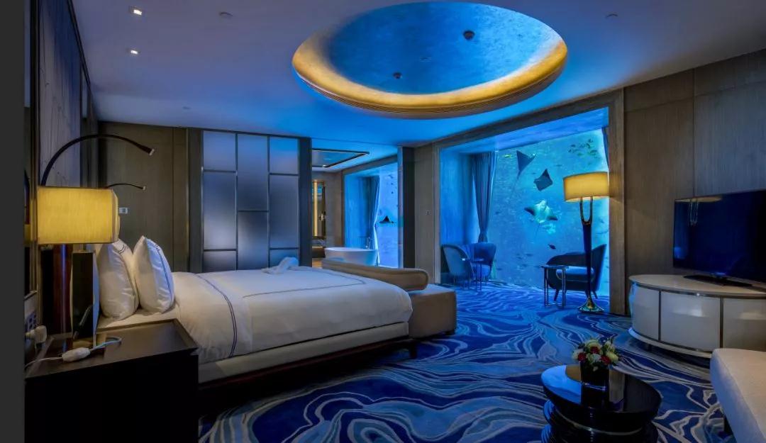 透過臥室和浴室的落地窗即可欣賞水族館大使環(huán)礁湖的壯麗景致,與奇趣曼妙的海洋生物共居,枕著海底世界悅?cè)恍蓓?/p>