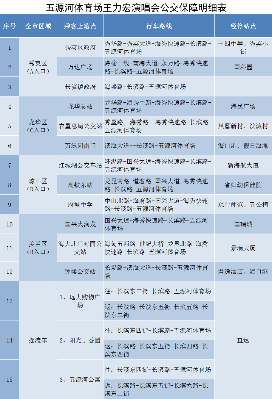 據了解,海口公交集團在秀英區(秀英區政府、萬達廣場、長流鎮政府,A區口上下車)、龍華區(龍華總站、農墾總局公交站、萬綠園南門,C區口上下車)、瓊山區(紅城湖公交車站、高鐵東站、府城中學,D區口上下車)、美蘭區(國興大潤發、海大北門對面公交站、鐘樓公交站,B區口上下車)共設置12個免費公交專線接送點。同時在五源河體育場周邊遠大購物廣場、陽光丁香園、五源河公寓等區域設置3個免費公交擺渡點。