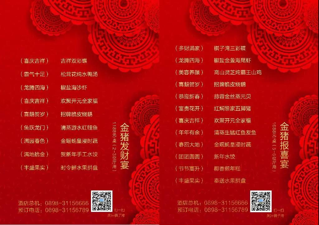 預定年夜飯套餐,大廳每桌贈送開元樂菲斯紅酒一瓶,椰樹牌椰汁一盒,新年吉祥物一個。