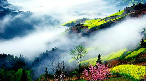 石潭村是一塊遠離城市喧囂的凈土,春賞桃花油菜花,夏享綠樹濃蔭,秋觀紅葉白菊,冬游雪舞林幽。四季常有云霧縹緲,宛如仙國勝境。