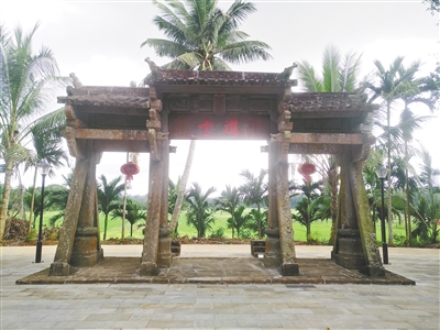 一條硬化村道穿過門墻,通往綠樹環繞的村莊,檳榔林、青皮竹林、椰樹林相間植于道路兩旁,散落的民居在林間隱約可見。行車不到10分鐘,眼前便出現一片開闊的田洋,嫩綠的禾苗沐浴著陽光,一座全石結構的古牌坊面田洋而立,格外醒目。