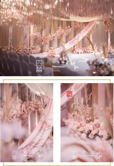 本次婚禮秀在??谙瞾淼蔷频晡逯扪鐣d舉行?;槎Y秀現場采用時下流行的“粉、金”色為主基調,桃花粉的清新搭配富麗的金色,巧妙地營造出新中式婚禮的氛圍,為嘉賓帶來唯美精致的婚尚體驗。