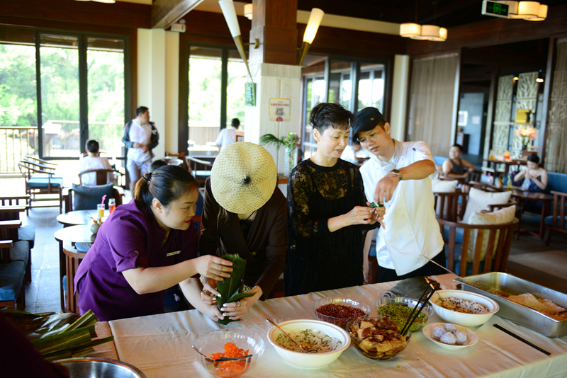端午節(jié)當(dāng)天,鳥巢度假村在云頂大堂吧舉辦包粽子活動,來自五湖四海的住店客人親身體驗(yàn)了這一傳統(tǒng)民俗活動。包好的粽子經(jīng)過登記與烹煮后,客人還可以免費(fèi)品嘗到親手包的粽子。除外,鳥巢度假村在端午節(jié)當(dāng)天,推出餐廳單點(diǎn)用餐即送粽子的活動,讓更多游客歡度佳節(jié)。
