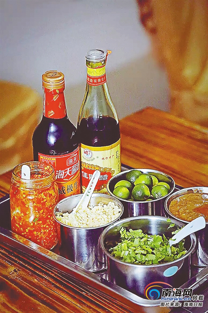 “蒜末、香菜、什錦醬、小桔子、辣椒醬,這些調料是餐桌上的必備選項。在其他地區,我們很少看到吃一頓飯能有這么多的蘸料。人們根據自己的喜好、口味去調配調料,同一桌的菜肴就能吃出不同的味道。”吳盛群說,海南人的餐桌上,辣椒最大的作用就是點蘸,雖然扮演的是配角,卻是不可或缺的。