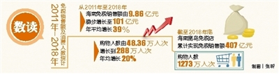 吸引力越來越強的免稅購物政策,帶來的是直觀的銷售額和消費人數(shù)提升:從2011年至2018年,海南免稅銷售額由9.86億元穩(wěn)步增長至101億元,年平均增長39%;購物人數(shù)由48.36萬人次增長到288萬人次,年均增長20%。截至2018年底,海南離島免稅店累計實現(xiàn)免稅銷售額407億元,購物人數(shù)1273萬人次。