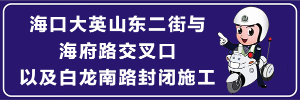 由于海口市政道路改造施工需要,從7月16日0時起,將對大英山東二街與海府路交叉口、海府路與白龍南路交叉路口互通工程項目進行施工。施工期間大英山東二街與海府路交叉口將全部封閉,白龍南路由南向北也將封閉施工。
