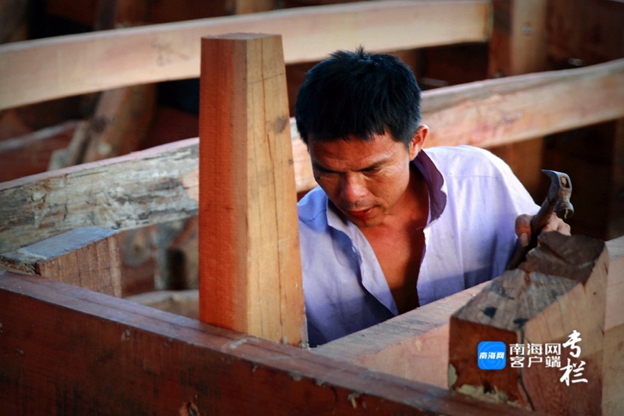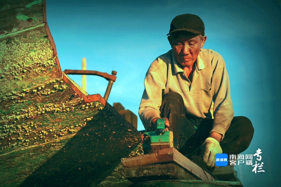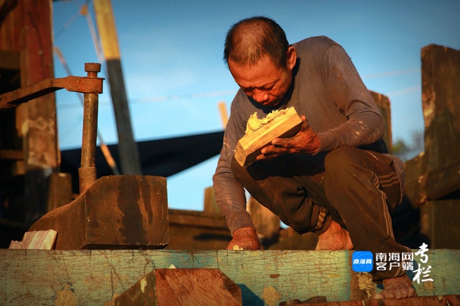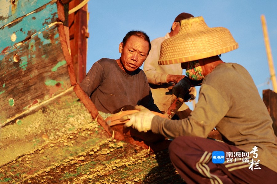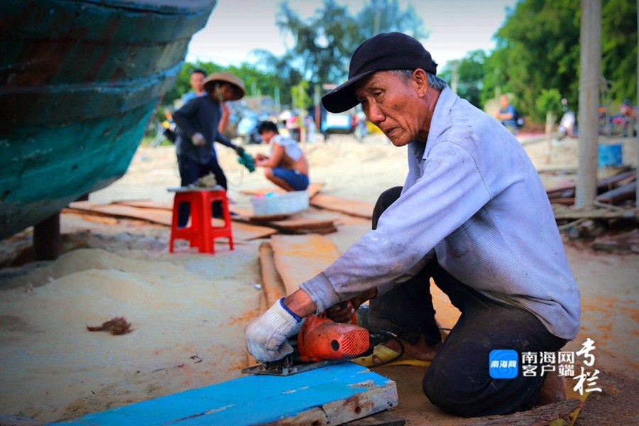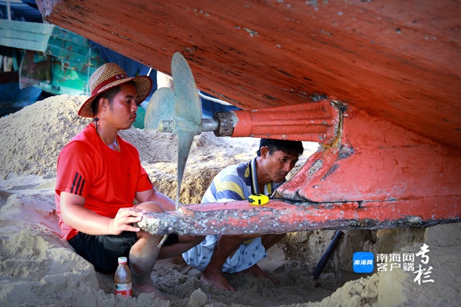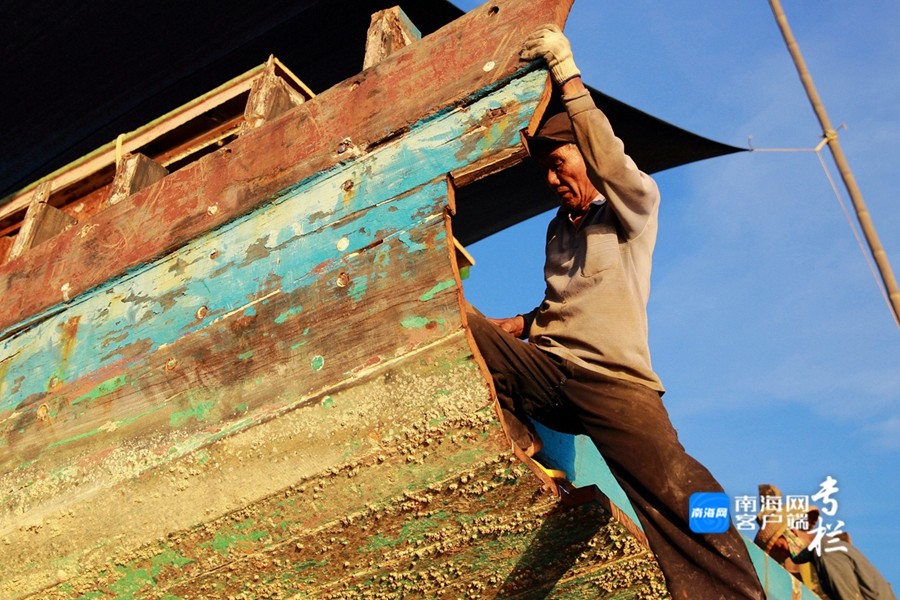 漁民正認(rèn)真地對(duì)漁船進(jìn)行檢修,維修漁船的敲擊聲、切割聲和焊接聲此起彼伏。南海網(wǎng)客戶端拍客 劉文芫 攝