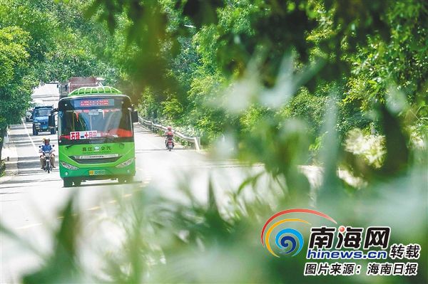 8月15日,在昌江黎族自治縣棋子灣旅游公路上,一輛新能源公交車正從縣城開往十月田鎮。昌江目前在運營的城鄉新能源公交一共有56輛,今年在城鄉新增投入使用的新能源公交車有5輛,大大改善了城鄉間的交通出行狀況。