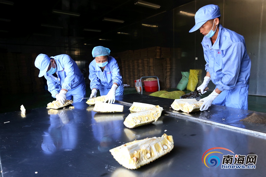 南金農(nóng)場(chǎng)公司菠蘿蜜加工廠的工人正在切割菠蘿蜜。南海網(wǎng)記者陳望 攝