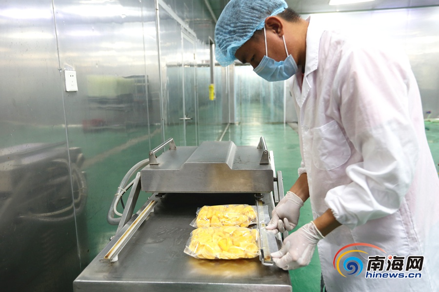 南金農(nóng)場(chǎng)公司菠蘿蜜加工廠的工人對(duì)菠蘿蜜果肉進(jìn)行包裝。南海網(wǎng)記者陳望 攝