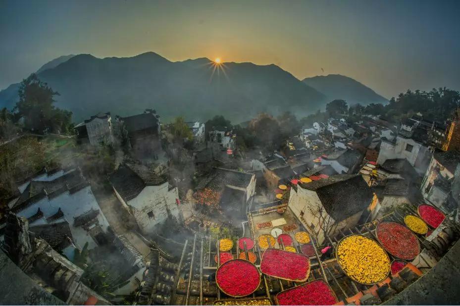 Tips:篁嶺屬典型山居村落,數(shù)百棟微派古宅圍繞水口呈扇形梯狀錯落排布,梯田疊翠鋪綠,村莊聚氣巢云,被稱為“梯云人家”。微派民居特色的白墻黑瓦飛檐鑲嵌在青山碧水間,余煙裊裊,描繪出一幅山里人家風情畫卷。放眼望去,日出山谷,斜陽朗照,古村家家戶戶晾出曬秋竹制簸箕,曬滿了辣椒、夏菊、玉米、稻谷等五顏六色農(nóng)作物,閃耀著象征豐收的色彩,美不勝收。