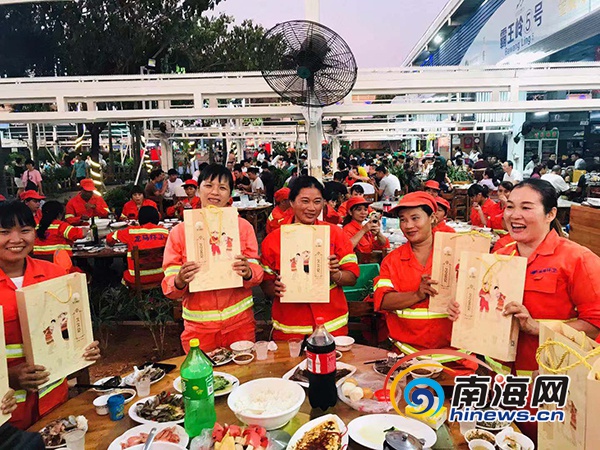 現場就餐的環衛工人們臉上都洋溢著幸福,紛紛記錄下這美好的時刻。一名環衛工人向記者表示,能與同事們在火車頭萬人海鮮廣場聚餐,很高興,感謝火車頭萬人海鮮廣場以及領導的關懷。