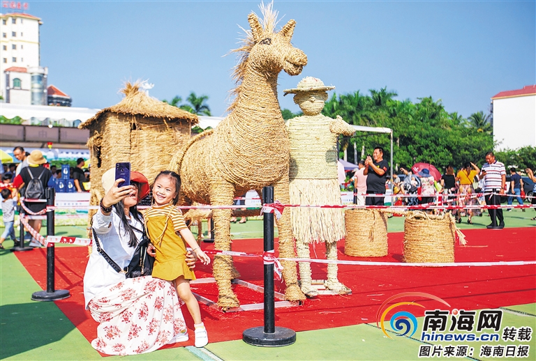 2019海南(樂東)農(nóng)民豐收節(jié)現(xiàn)場,稻草制成的動物形象吸引群眾拍照留念。