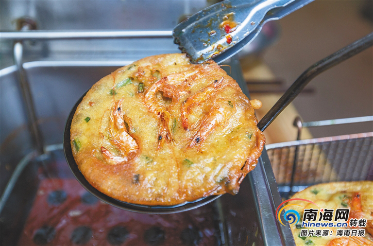 正對著三亞第一農貿市場大門的椰香香甜品店是當地小有名氣的小吃店。該店鋪并不起眼,招牌也不醒目,但絡繹不絕的食客足以證明店里食物的美味。店家王春琳告訴海南日報記者,這家小吃店已經開了二十余年,最受歡迎的小吃就是醬爆蝦餅。和面、制餅、煮蝦、下鍋煎炸,王春琳手法嫻熟。不到3分鐘,鮮蝦和面餅的香味在滾燙的油鍋中釋放出來,澆上店家自制甜辣醬,令人垂涎欲滴。一邊大快朵頤,一邊與店家閑話家常,感受到的是市井生活的踏實與美好。