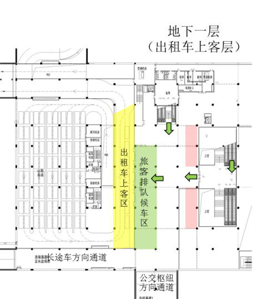 前往海汽客運(yùn)總站的出租車和從海汽客運(yùn)總站地下車場(chǎng)入口駛?cè)耄诘叵萝噲?chǎng)落客后待客或直接離場(chǎng),旅客下車后通過(guò)地下通道出口到達(dá)海汽客運(yùn)總站地面廣場(chǎng)。