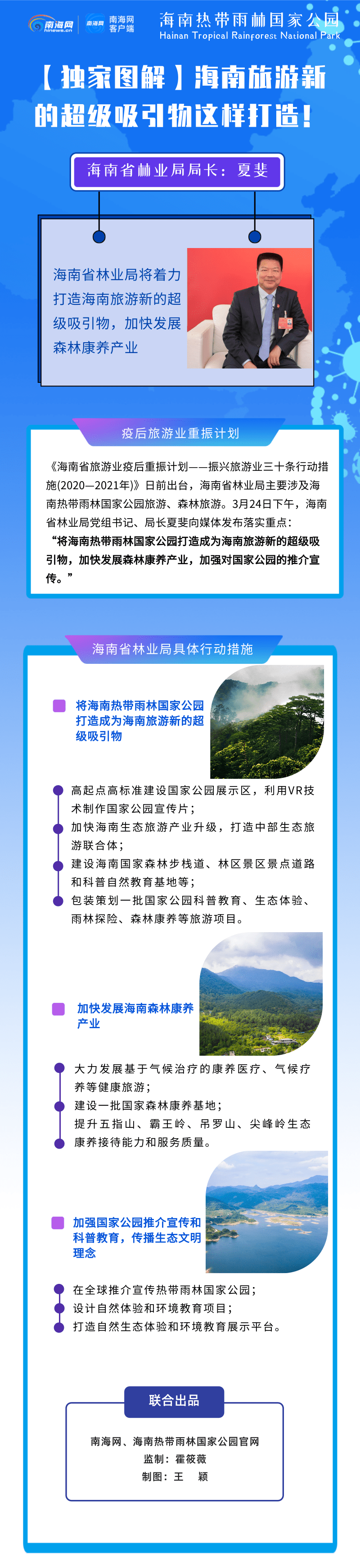 《海南省旅游業疫后重振計劃——振興旅游業三十條行動措施(2020—2021年)》日前出臺,海南省林業局主要涉及海南熱帶雨林國家公園旅游、森林旅游。3月24日下午,海南省林業局黨組書記、局長夏斐向媒體發布落實重點: