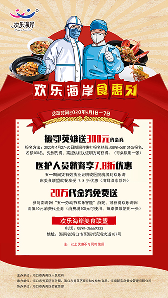 即日起至4月30日,主辦方通過南海網征集100名海南支援湖北戰“疫”英雄,每名發放300元歡樂海岸消費代金券。符合條件人員可撥打(0898-66810165)進行報名。5月1日-7日,在歡樂海岸就餐時,提供相關證明即可獲得300元消費代金券。