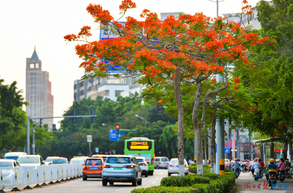 海口市濱涯路上鳳凰樹花開正艷,美不勝收。(資料圖)海口日報記者 康登淋 攝