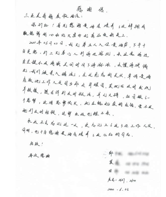 被救后,4名來(lái)自江西的游客抱著黃觀龍等人一個(gè)勁地道謝地說(shuō)。離開(kāi)三亞時(shí),他們給酒店寫了一封感謝信和贈(zèng)送一面錦旗表達(dá)他們由衷的謝意。