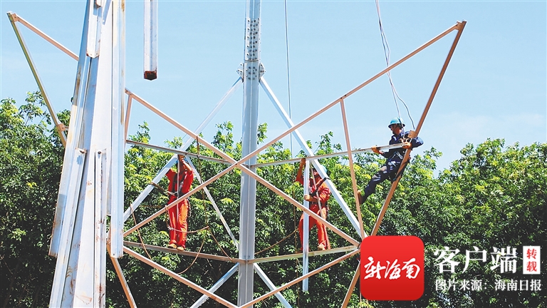 6月26日,在文昌氣電π接220千伏玉洲至江東線路新建工程施工現(xiàn)場(chǎng),施工人員正在組塔。通訊員 王妍馨 攝