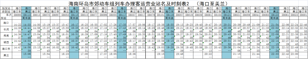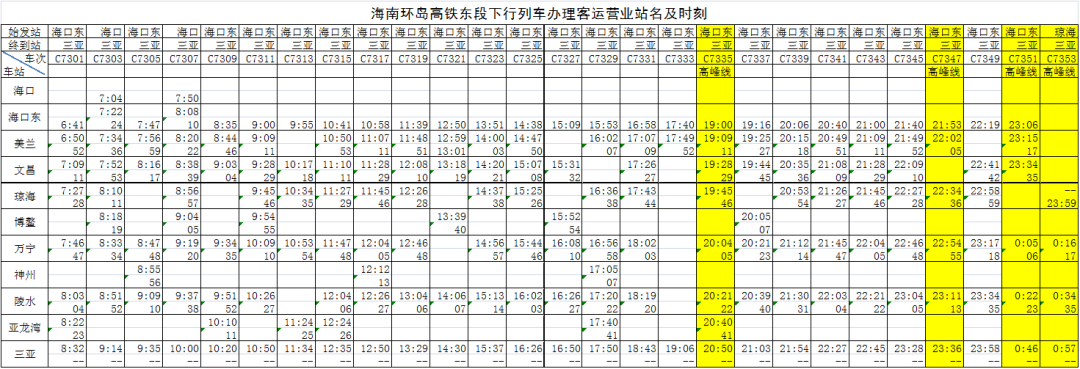 據(jù)了解,海南環(huán)島高鐵新列車運行圖開行“C”字頭動車組列車47.5對,其中東段本線27對,西段本線3對,三亞至三亞環(huán)島10.5對,海口東至海口東環(huán)島7對,較舊圖增加2對。新圖仍分為日常圖和周末圖。日常圖開行C字頭動車組列車36.5對,其中海南環(huán)島高鐵東段本線23對,三亞至三亞環(huán)島列車7.5對,海口東至海口東環(huán)島列車6對,較舊圖增加3對;周末圖開行C字頭動車組列車39.5對,其中海南環(huán)島高鐵東段本線23對,三亞至三亞環(huán)島列車10.5對,海口東至海口東環(huán)島列車6對,較舊圖增加3對。海口市郊列車方面部分時刻發(fā)生變化,開行對數(shù)方面未進行調(diào)整。
