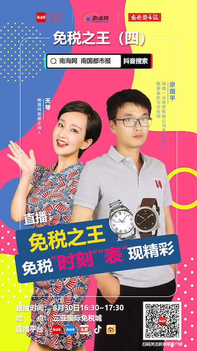 本期《免稅之王——黃金購物袋》,我們將帶您來一場海南免稅名表購物之旅。天梭、萬國、浪琴……免稅名表有多優惠?品牌有多給力?8月30日下午4:30,新海南客戶端,南海網、南國都市報抖音號將邀您一同探店,屆時,海南一點珠寶有限公司珠寶鑒定師、腕表鑒定與評估師廖國平將獲邀作為評測嘉賓,帶大家一起品鑒各類名表。我們在直播間不見不散,敬請關注。