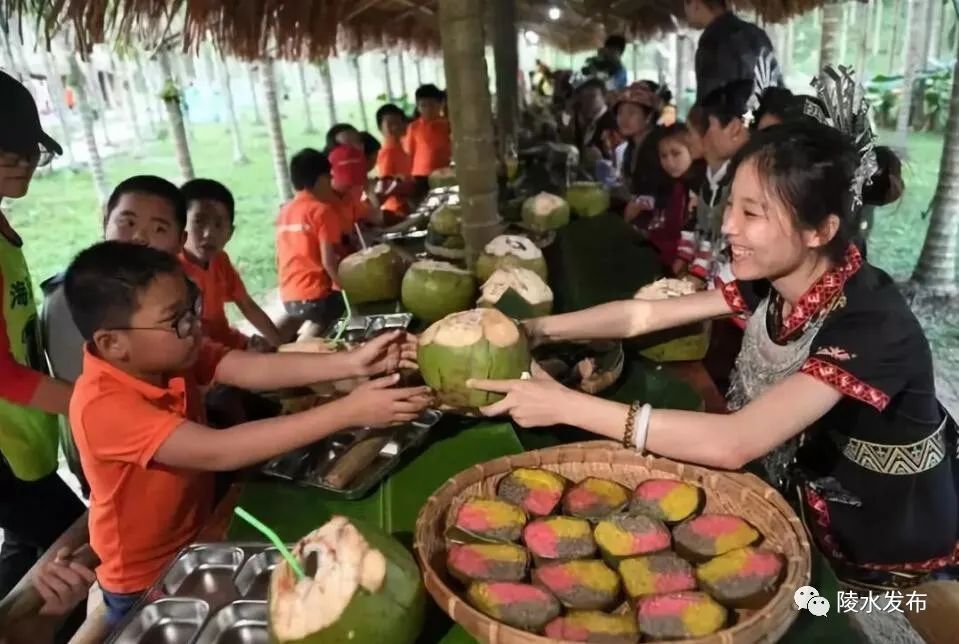陵水小妹村黎峒部落民宿的服務員給游客送椰子