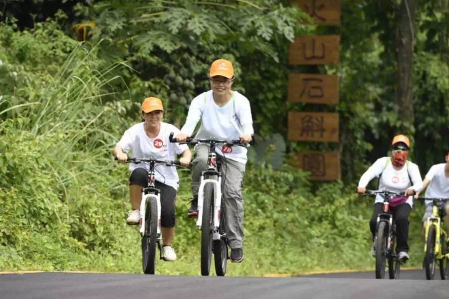游客在施茶村石斛園里騎行。海口日報記者 黃一冰 攝
