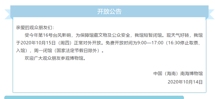 新海南客戶端、南海網、南國都市報10月14日消息(記者 蘇桂除)記者從中國(海南)南海博物館了解到,受今年第16號臺風影響,實行短暫閉館的中國(海南)南海博物館將于10月15日正常對外開放。免費開放時間為9:00—17:00(16:30停止取票、入館),周一閉館(國家法定節(jié)假日除外)。
