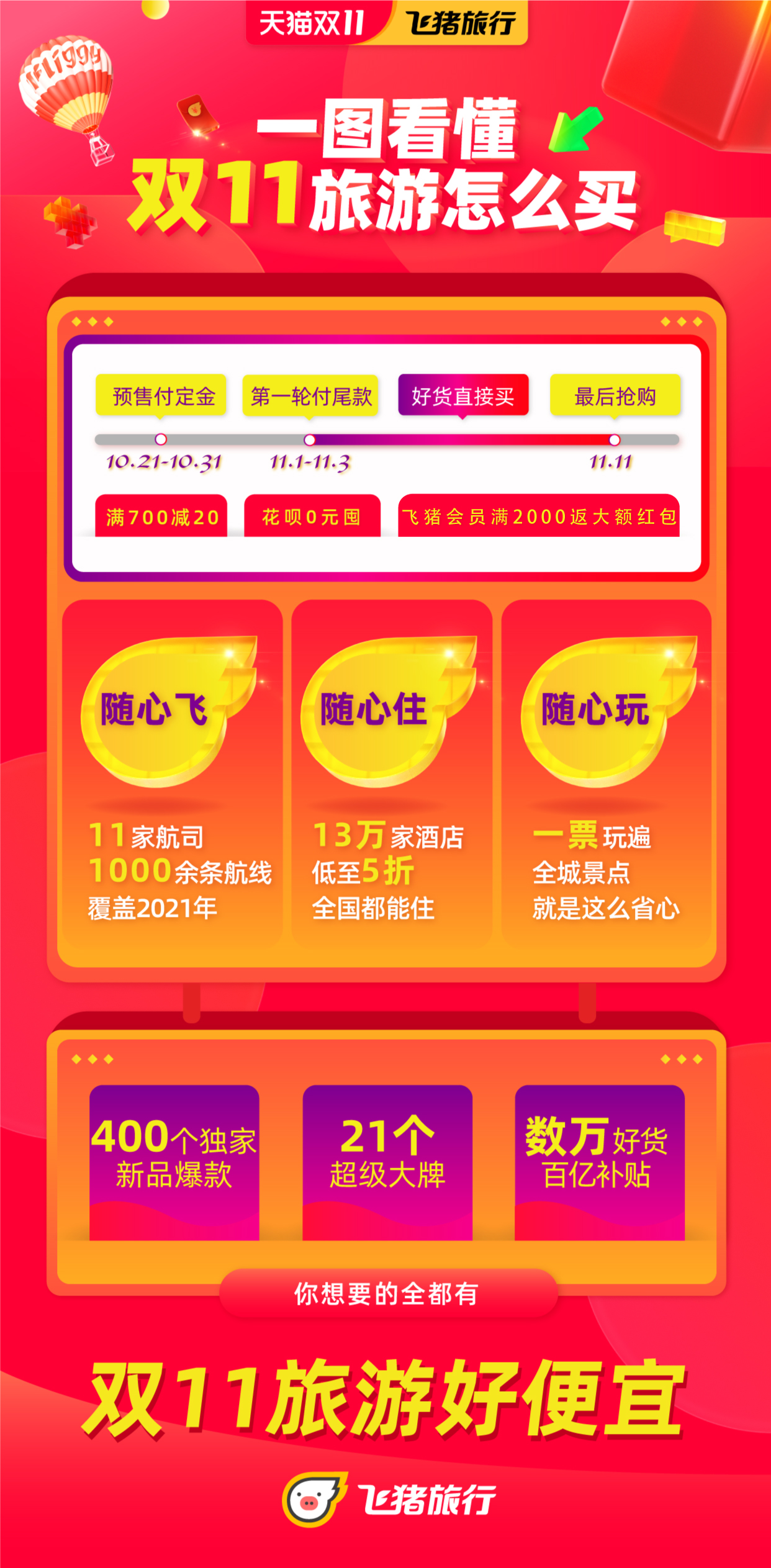 新海南客戶端、南海網、南國都市報10月21日消息(通訊員 高星 記者 鐘瑜)天貓雙11不僅買買買,更要玩盡興!10月21日零點,天貓雙11旅游好貨在飛豬、淘寶、支付寶同時開售,買便宜、買獨家、買新品成為今年旅游購物車的亮點。