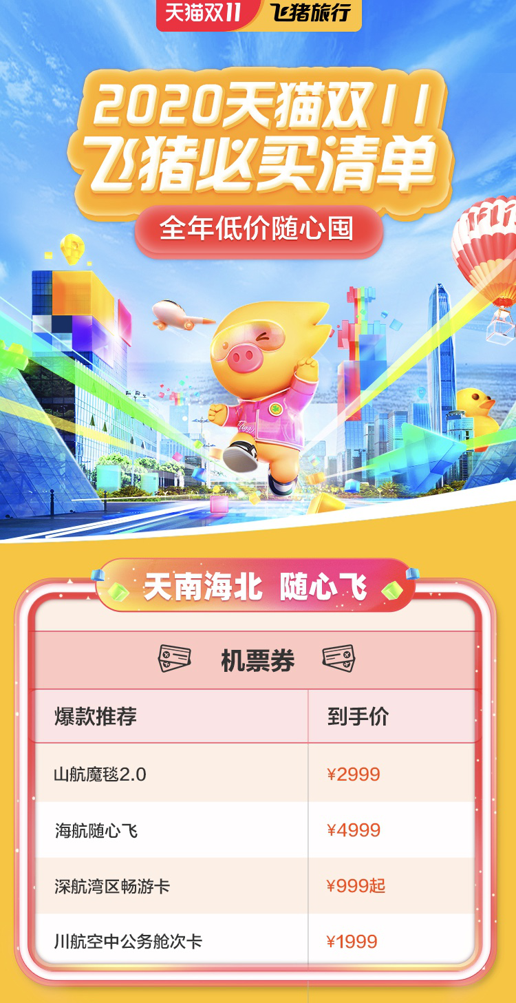雙11便宜不能少。飛豬“隨心住”“隨心玩”,讓品質旅行好玩不貴。全國超13萬家酒店低至5折,花不到100元就能住上知名連鎖,五星酒店萬豪全國“隨心住”每晚僅需不到500元。想看上海杭州的四季風光,只花399元就能把全城必去景點刷個遍,一舉贏下朋友圈。最應景的冬季旅游剛需東北雪場和海南陽光沙灘,飛豬也全幫大家都想到了,更有自貿港免稅店折扣。