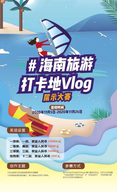 參賽者可以在抖音平臺發布與Vlog大賽主題相關作品,并在文中帶“#海南旅游打卡地Vlog#”并“@海南旅文”“@南國都市報”官方抖音號即為參賽成功。