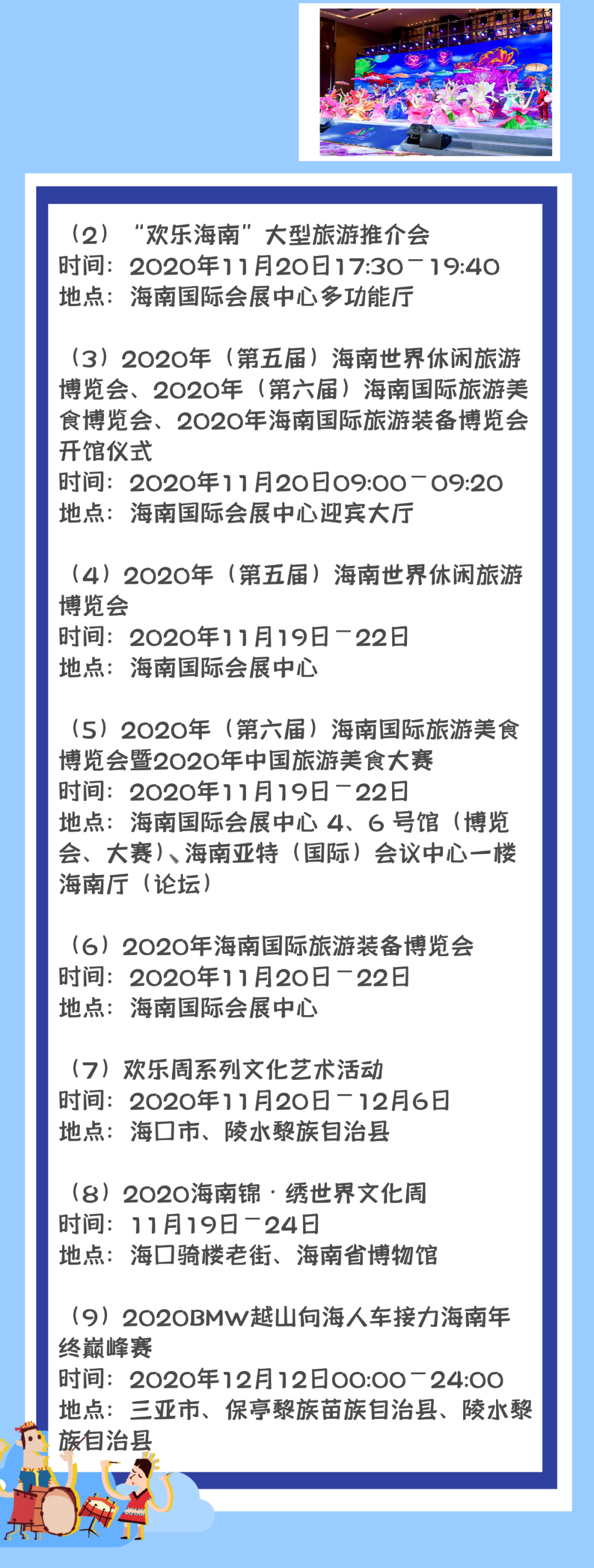2020年海南國際旅游島歡樂節開幕式上,演出團體將會帶來充滿國際風情和海南本土民俗特色的演出,展示海南獨特的民俗文化及國際風情。
