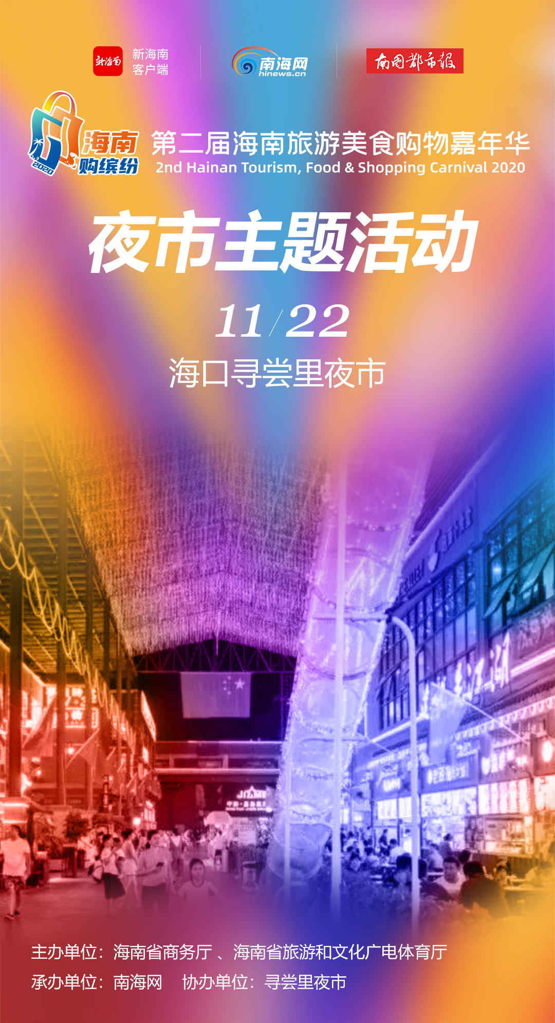 2020第二屆海南旅游美食購物嘉年華活動由海南省人民政府指導,省商務廳、省旅文廳組織,各市縣政府和各相關省直部門主辦,南海網承辦。本屆嘉年華聚焦免稅品、汽車、餐飲、家電、網絡零售等重點領域,實行各市縣聯動、線上線下互動,組織千企萬店共同參與。精心營造歡樂、活力、時尚、誠信的購物與休閑娛樂氛圍,吸引本地居民走出家門,外地游客聚集海南。組委會歡迎各大商家積極參與(參與熱線:13637540372、13976222851)。