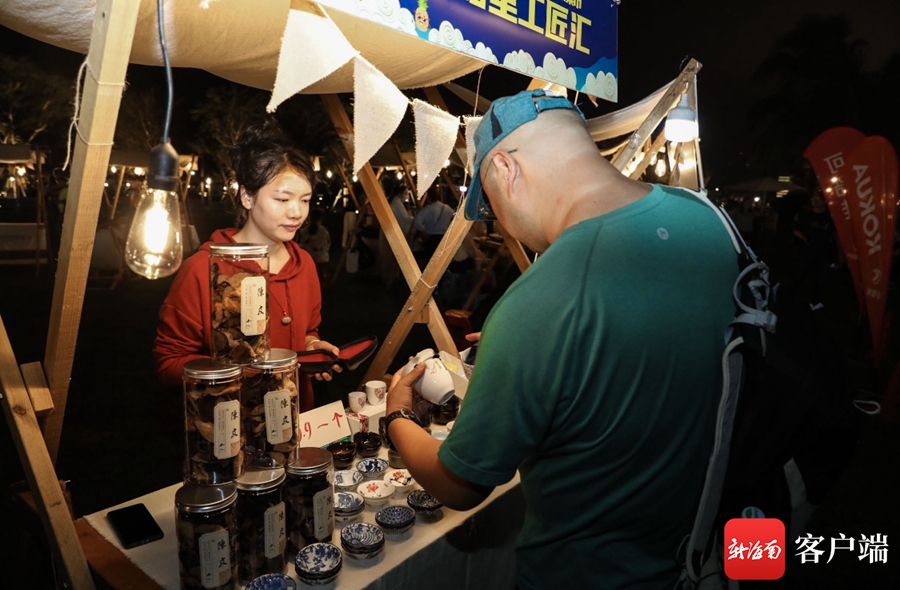“卡路里工匠匯”區域設置了特色攤點,在這里,人們不僅可以看到海墾廣場招商洽談宣傳,還可以看到海南免稅店的產品展示,甚至能看到海南一村一品發展研究會帶來的海南特色農產品。
