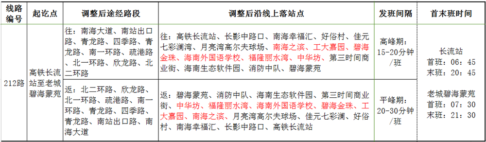 212路線網結構局部微調,滿足市民訴求,解決澄邁老城四季康城、工大嘉園、碧海金珠、海南外國語學校、福隆麗水灣、中華坊等片區居民公交出行。