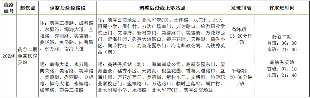 增加站點:往返增加海秀橋、秀英規劃分局、秀英區政府、省醫院留醫部、市十四中、海玻市場、泓環廣場、麗晶花園、高鐵秀英站。