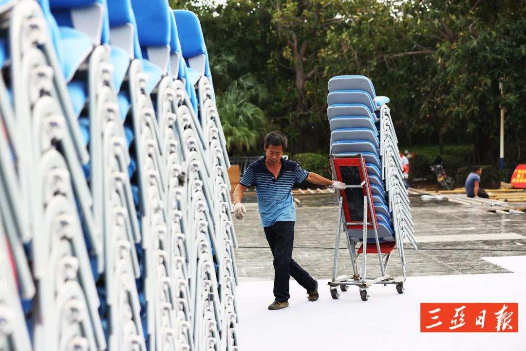 舞臺前擺放的椰樹、電影膠卷等裝飾品呈現(xiàn)著椰風(fēng)海韻,“影”味十足。舞臺下紅色和藍(lán)色的座椅也被整齊排開,屆時現(xiàn)場可容納近3100人觀禮。