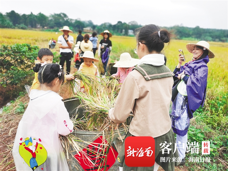 豐收時節,澄邁縣福山鎮保良村前的稻田在陽光照耀下,泛著金色光芒,成熟、低垂的稻穗如謙卑、慈祥的老者。近處村道旁的稻田里,近百名從海口趕來體驗農事的游客,在村民的示范下,割稻谷,打稻穗……