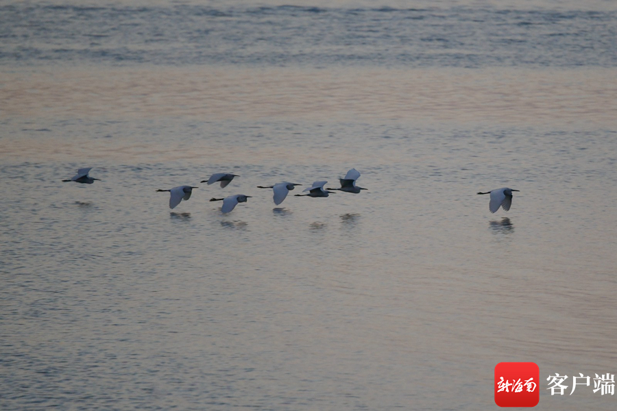 1月1日傍晚,一群白鷺貼著海面從海口灣飛過。記者 陳衛東攝