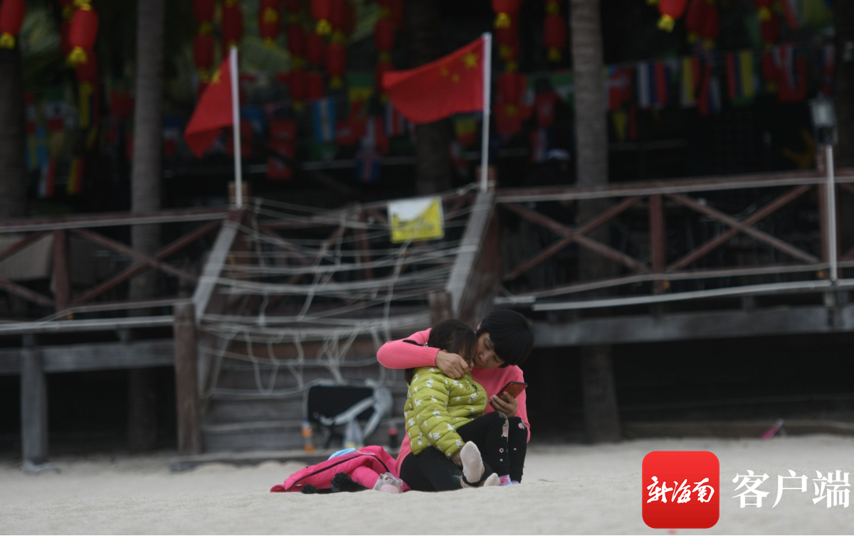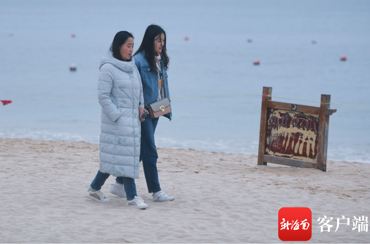 1月11日,穿羽絨服的游客在海灘上游玩。記者 沙曉峰 攝