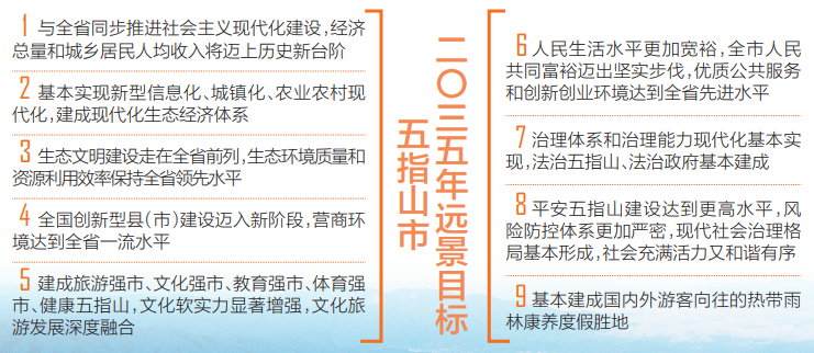 《建議》指出,“十四五”時(shí)期,五指山市要緊緊圍繞“生態(tài)核心區(qū)”戰(zhàn)略定位,積極融入海南自由貿(mào)易港建設(shè),充分發(fā)揮資源環(huán)境優(yōu)勢(shì),爭(zhēng)創(chuàng)海南中部中心城市,加快建設(shè)熱帶雨林康養(yǎng)度假勝地,將五指山打造成為海南熱帶雨林國(guó)家公園的靚麗名片,爭(zhēng)創(chuàng)國(guó)家生態(tài)文明試驗(yàn)區(qū)建設(shè)生動(dòng)范例。