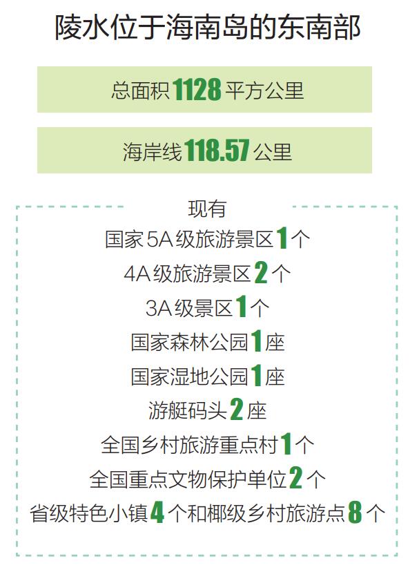 近年來,陵水全縣旅游基礎設施、旅游服務功能不斷完善,旅游業發展水平得到明顯提升——全縣覆蓋雙語標識標牌,建成A級旅游廁所48座、高星級標準酒店13家、品牌連鎖酒店9家、評級民宿4家,建設旅游大數據監管平臺、南海海域休閑船艇監控調度指揮中心暨海上旅游大數據中心和南海海上旅游數據共享平臺,主要景區景點覆蓋智慧旅游服務。