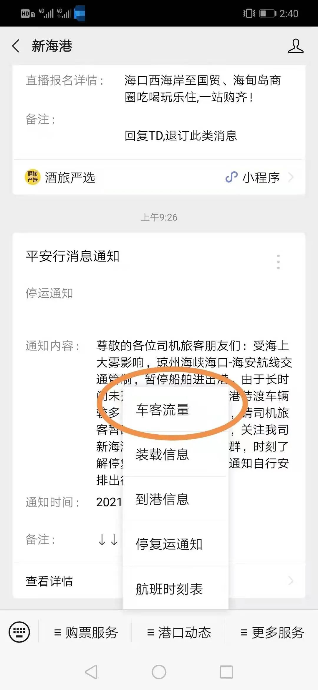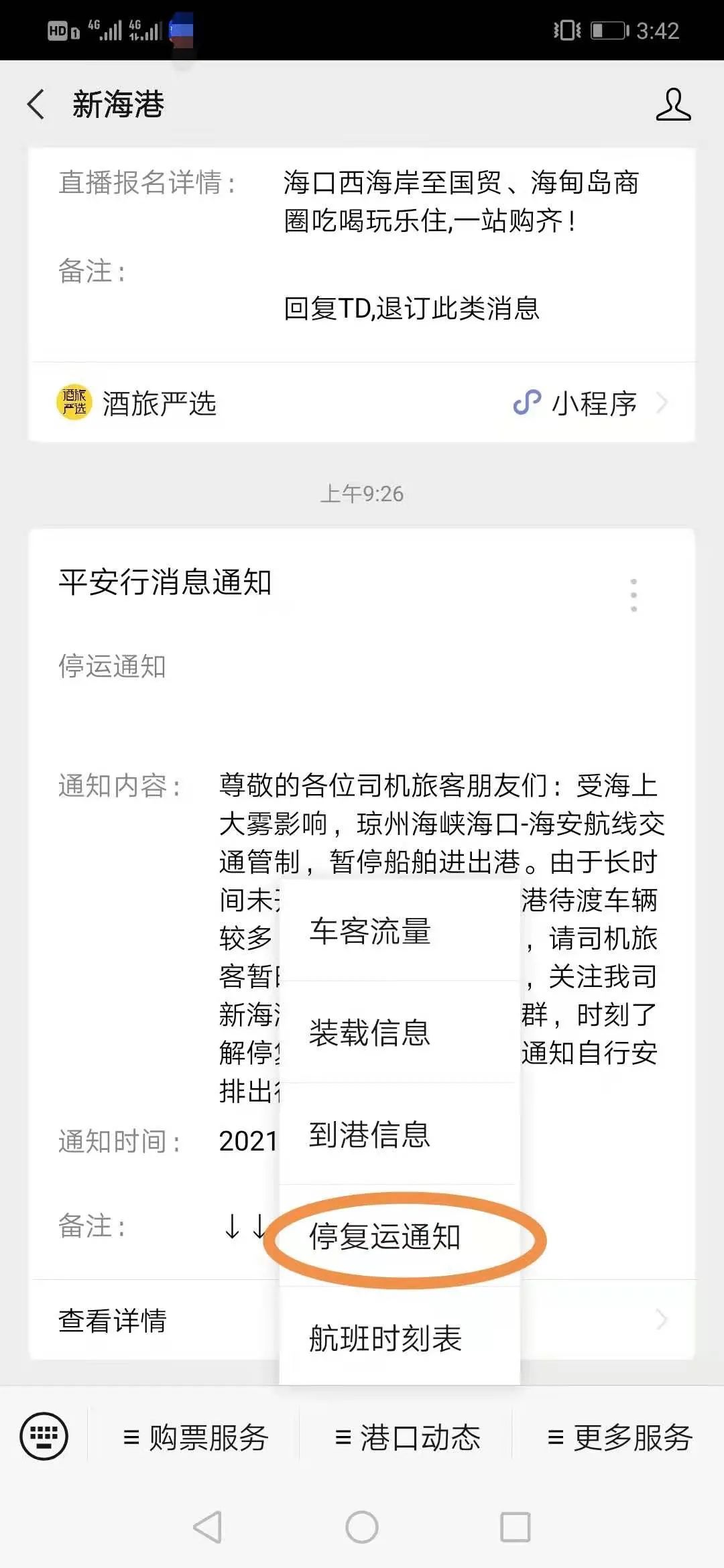 二、關注“新海港”或“瓊州海峽輪渡管家”微信公眾號,停復運時該微信公眾號將第一時間更新信息,也可點擊停復運通知查看實時停復運信息。